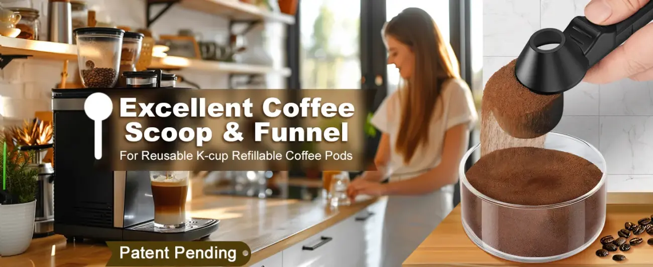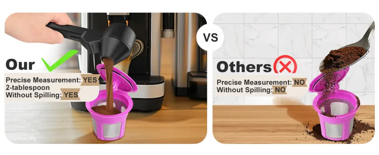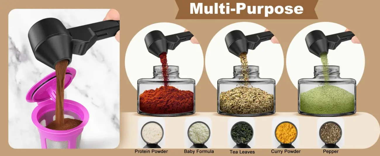- Smart 2-in-1 Design: Combines a precise measuring scoop and a leveling funnel in one tool. Perfect for refilling reusable K-cup pods, jars, and narrow containers without any mess.