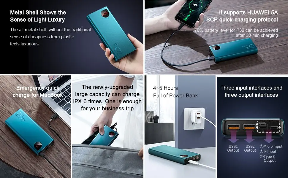 It supports PD3.0+QC3.0 tw o-way quick charge Self-charging is also very fast - Compatible with Various Mobile Phones