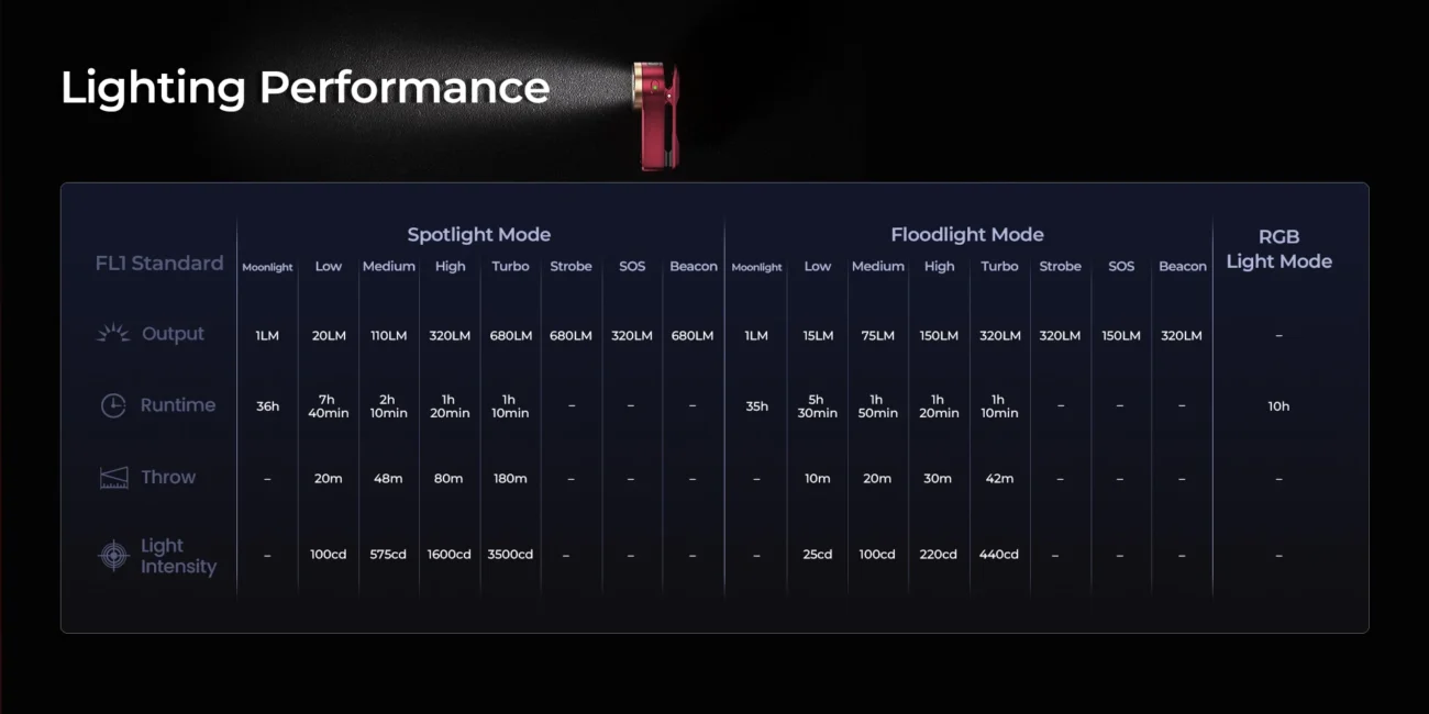 - Lighting Modes: Turbo, High, Medium, Low, Moon, Strobe, SOS, Beacon.