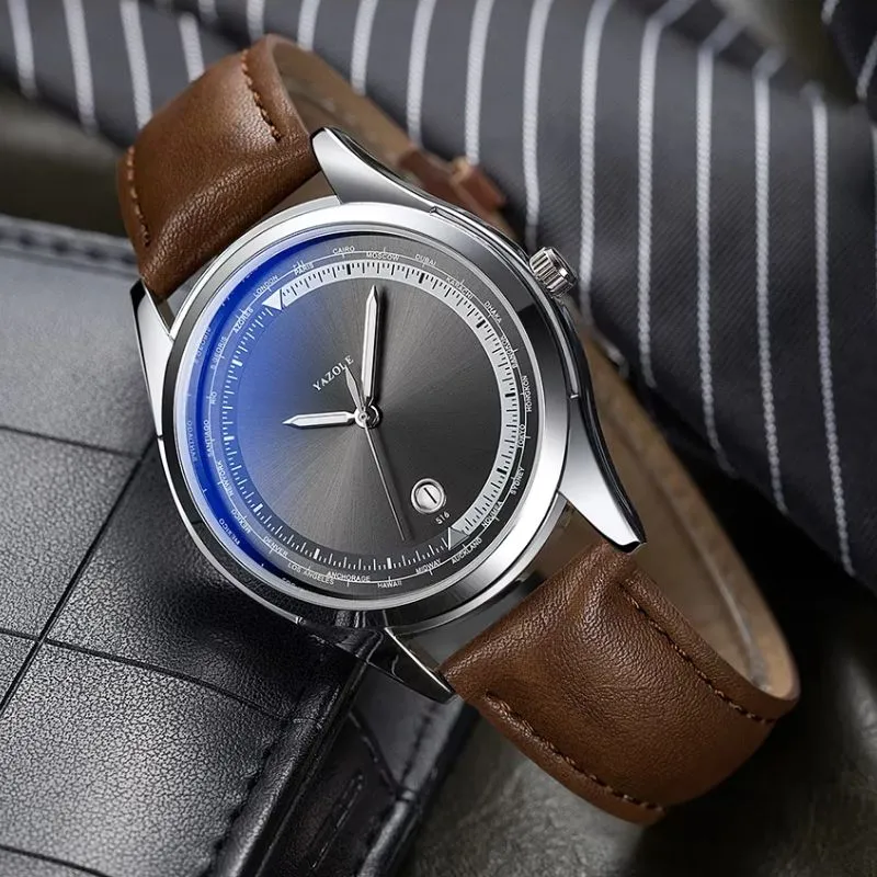 Yazole Men’s Classic Leather Watch – Brown Strap – Black Dial